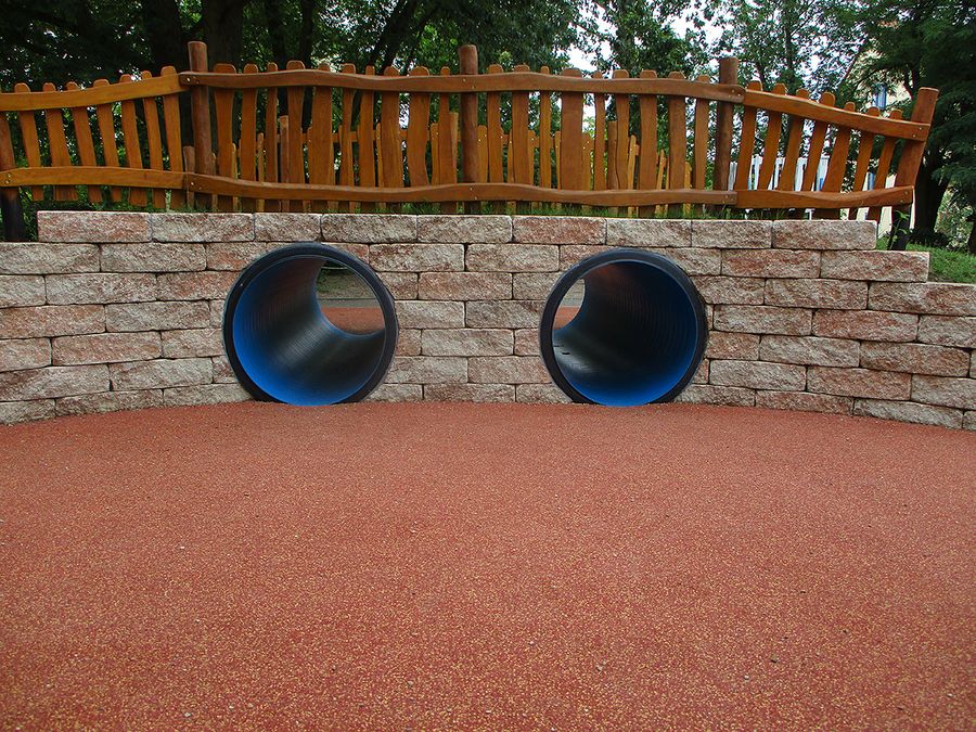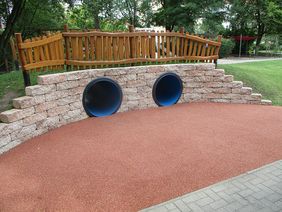 Am Anfang stand eine Idee der Kita-Leitung, den alten und sehr in die Jahre gekommenen Rutschenhügel neu und vor allem attraktiver zu gestalten. Gerade das Thema der vielseitigen und aktiven Beschäftigung der Kinter stand im Zentrum der Überlegungen. Und wie so oft, war auch ein begrenztes finanzielles Budget zu berücksichtigen. Also mussten wir die örtlichen Gegebenheiten bestmöglich integrieren. Schließlich kam uns aus zuvor realisierten Projekten die Idee der Tunnelröhren. Erweitert um eine Trockenmauer auf beiden Seiten als gestalterisches Element sowie einem dämpfenden Kunststoffbelages als Fallschutz.