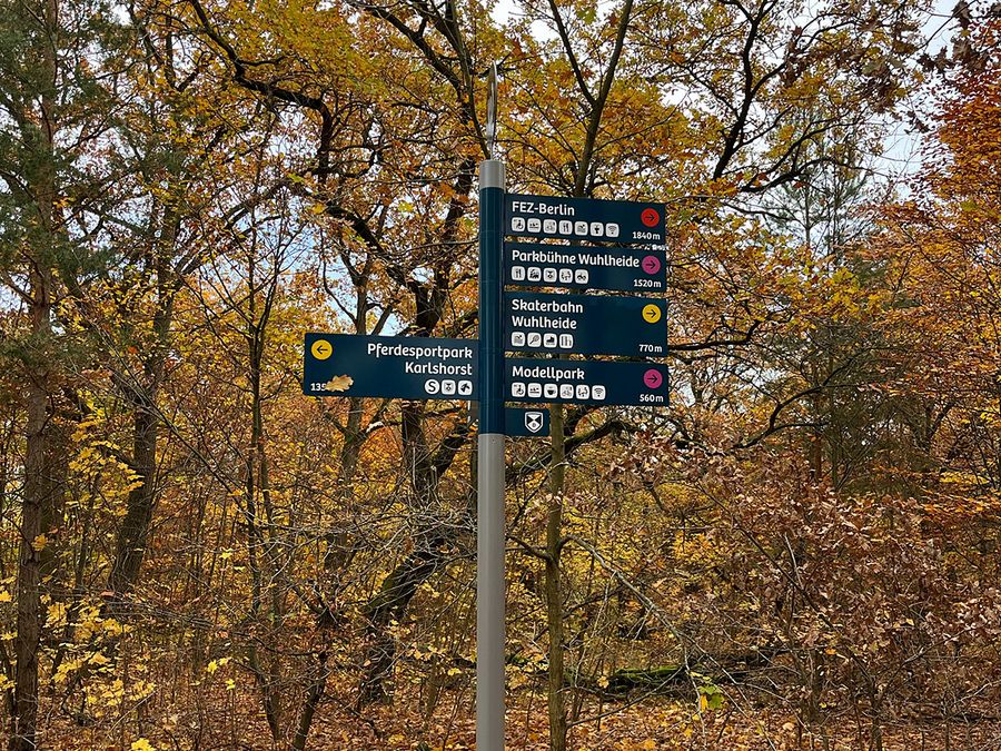 Die Wuhlheide zählt zu den wichtigsten Naherholungsgebieten im Berliner Südosten und beherbergt neben dem Freizeit- und Erholungszentrum (FEZ) auch die Parkbühne Wuhlheide, Sport- und Spielplätze sowie ein weit verzweigtes Netz an Wegen und Freiflächen. Um die Orientierung im Gelände zu erleichtern, wurde das bestehende, uneinheitliche Schildernetz vollständig überarbeitet und durch ein neues, nutzerfreundliches Leitsystem ersetzt.