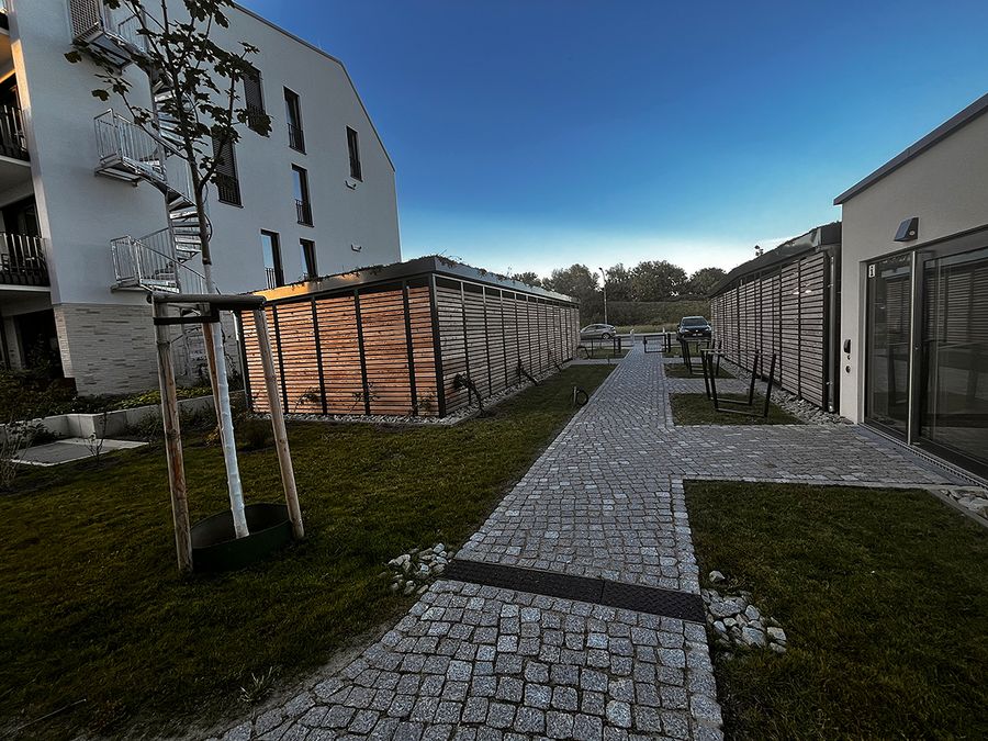- Ausstattung mit Müllhäusern, Fahrradhäusern, Pollern, Fahrradständern, Sonnenschirmhülsen und einem Weihnachtsbaumständer