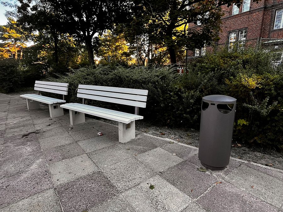 Die Sanierung des Peter-Weiss-Platzes war sowohl durch den strengen Denkmalschutz als auch durch den Bestandsschutz der Bäume geprägt. Der Denkmalschutz verlangte, die charakteristische Gestaltung der 1970er-Jahre weitgehend zu erhalten. So wurden die klassischen Bankfüße bewahrt und die original eingefärbten Betonplatten wiederverlegt, um die historische Anmutung des Platzes zu sichern. Gleichzeitig musste der wertvolle, alte Baumbestand geschützt werden. Bei allen Rückbau- und Neubauarbeiten kamen spezielle Schutzmaßnahmen wie wurzelschonende Bauweisen, angepasste Fundamente und Abgrenzungen des Wurzelraums zum Einsatz. Besonders die neue Steganlage wurde so konstruiert, dass keine Eingriffe in das empfindliche Wurzelwerk erforderlich waren.